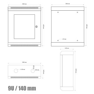 *10" nástěnné provedení pro instalaci 10"komponent datové sítě *svařovaný skelet rozvaděče o síle 1,5 mm /ocelový plech/ *nastavitelná hloubka předních vertikálních lišt *v horní/spodní části rozvaděče perforace pro odvětrání *vylamovací záslepky pro vstup kabelu v horní/spodní části *otevření dveří možné až po úhel 225° *snadná výměna levé/pravé otevírání *4 předvrtané otvory pro uchycení na zeď *maximální doporučená využitelná hloubka rozvaděče 100 mm *krytí rozvaděče IP30