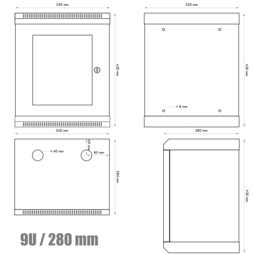 Rozvaděč obsahuje *přední posuvné 9U vertikální lišty *dveřní zámek + 2 klíče
