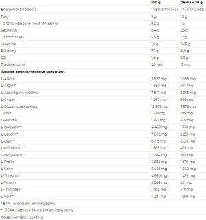 Přichází zcela nová generace prémiového proteinu s vylepšenou recepturou. Koktejl namíchaný z těch nejkvalitnějších surovin. Základ produktu tvoří prémiový ultrafiltrovaný koncentrát mléčné syrovátky (WPC) spolu s nejčistší formou izolátu syrovátkové bílkoviny (WPI). Díky technologii Cross-Flow Microfiltration (CFM) si bílkoviny zachovají všechny biologicky účinné složky pro maximální efektivitu vašeho tréninku. Patentovaná surovina INSTANT WHEY pak zajišťuje perfektní rozpustnost proteinu pro dokonalý komfort přípravy vašeho proteinového nápoje. Syrovátková bílkovina pochází z prvotřídního mléka splňující certifikaci GRASS FED. Ekologické chovy krav zabezpečují volnou pastvu skotu na loukách 10 měsíců v roce, jejich strava se skládá minimálně 90 % z čerstvé trávy nebo pícnin. Vynikající stravitelnost zajišťuje značková směs trávicích enzymů a lahodné příchutě potěší vaše smysly. Prémiový produkt s vysokou biologickou hodnotou je ideální pro obnovu svalové tkáně a svalový růst. - až 73 % bílkovin - instantizovaný syrovátkový protein (WPC, WPI) - použité suroviny splňují certifikaci GRASS FED - až 24 % WPI - až 22 g bílkovin v jedné dávce - 5 g BCAA v jedné dávce - značková směs trávicích enzymů DigeZyme™ - bez umělých barviv - bez lepku Doporučené dávkování produktu 100% WHEY PROTEIN: dávku 30 g rozmíchejte ve 250 ml vody. V závislosti na denní potřebě bílkovin konzumujte 1 - 3 porce denně, mezi jídly. Maximálně 3 dávky denně. Nepřekračujte doporučené dávkování. Použití produktu 100% WHEY PROTEIN: 1 odměrka = cca 15 g. Dle doporučeného dávkování odměřte a rozmíchejte v šejkru. Po otevření skladujte při teplotě do 25 ºC a spotřebujte do 3 měsíců. Upozornění: Doplněk stravy, se sladidly. Nenahrazuje pestrou stravu. Není určeno pro děti do 12 let. Ukládejte mimo dosah dětí. Chraňte před teplem, mrazem a vlhkostí. Výrobce neručí za případné škody vzniklé nevhodným použitím nebo skladováním. Složení: Příchuť: banán & jahoda 78 % syrovátkový proteinový koncentrát (obsahuje slunečnicový lecitin a protispékavou látku fosforečnan vápenatý), 15,5 % syrovátkový proteinový izolát (obsahuje slunečnicový lecitin), aroma, bezlepková pšeničná vláknina, stabilizátory akáciová a xanthanová guma, koncentrát z červené řepy, protispékavá látka oxid křemičitý, chlorid sodný, směs trávících enzymů Digezyme® (amyláza, proteáza, laktáza, lipáza a celuláza), sladidla sukralóza a steviol-glykosidy. Může obsahovat stopy sóji. Příchuť: bílá čokoláda & kokos 80 % syrovátkový proteinový koncentrát (obsahuje slunečnicový lecitin a protispékavou látku fosforečnan vápenatý), 13,5 % syrovátkový proteinový izolát (obsahuje slunečnicový lecitin), aroma, bezlepková pšeničná vláknina, stabilizátory akáciová a xanthanová guma, protispékavá látka oxid křemičitý, chlorid sodný, směs trávících enzymů Digezyme® (amyláza, proteáza, laktáza, lipáza a celuláza), sladidla sukralóza a steviol-glykosidy Může obsahovat stopy sóji. Příchuť: cookies & Cream 80 % syrovátkový proteinový koncentrát (obsahuje slunečnicový lecitin a protispékavou látku fosforečnan vápenatý), 14,5 % syrovátkový proteinový izolát (obsahuje slunečnicový lecitin), aroma, bezlepková pšeničná vláknina, stabilizátory akáciová a xanthanová guma, protispékavá látka oxid křemičitý, chlorid sodný, směs trávících enzymů Digezyme® (amyláza, proteáza, laktáza, lipáza a celuláza), sladidla sukralóza a steviol-glykosidy. Může obsahovat stopy sóji. Příchuť: čokoládové brownies 65 % syrovátkový proteinový koncentrát (obsahuje slunečnicový lecitin a protispékavou látku fosforečnan vápenatý), 24 % syrovátkový proteinový izolát (obsahuje slunečnicový lecitin), kakao, bezlepková pšeničná vláknina, stabilizátory akáciová a xanthanová guma, aroma, protispékavá látka oxid křemičitý, chlorid sodný, směs trávících enzymů Digezyme® (amyláza, proteáza, laktáza, lipáza a celuláza), sladidla sukralóza a steviol-glykosidy. Může obsahovat stopy sóji. Příchuť: čokoláda & kakao 65 % syrovátkový proteinový koncentrát (obsahuje slunečnicový lecitin a protispékavou látku fosforečnan vápenatý), 24 % syrovátkový proteinový izolát (obsahuje slunečnicový lecitin), kakao, aroma, bezlepková pšeničná vláknina, stabilizátory akáciová a xanthanová guma, protispékavá látka oxid křemičitý, chlorid sodný, směs trávících enzymů Digezyme® (amyláza, proteáza, laktáza, lipáza a celuláza), sladidla sukralóza a steviol-glykosidy. Může obsahovat stopy sóji. Příchuť: čokoláda & kokos 65 % syrovátkový proteinový koncentrát (obsahuje slunečnicový lecitin a protispékavou látku fosforečnan vápenatý), 24 % syrovátkový proteinový izolát (obsahuje slunečnicový lecitin), kakao, aroma, bezlepková pšeničná vláknina, stabilizátory akáciová a xanthanová guma, protispékavá látka oxid křemičitý, chlorid sodný, směs trávících enzymů Digezyme® (amyláza, proteáza, laktáza, lipáza a celuláza), sladidla sukralóza a steviol-glykosidy. Může obsahovat stopy sóji. Příchuť: čokoláda & lískový ořech 65 % syrovátkový proteinový koncentrát (obsahuje slunečnicový lecitin a protispékavou látku fosforečnan vápenatý), 24 % syrovátkový proteinový izolát (obsahuje slunečnicový lecitin), kakao, aroma, bezlepková pšeničná vláknina, stabilizátory akáciová a xanthanová guma, protispékavá látka oxid křemičitý, chlorid sodný, směs trávicích enzymů Digezyme® (amyláza, proteáza, laktáza, lipáza a celuláza), sladidla sukralóza a steviol-glykosidy. Může obsahovat stopy sóji. Příchuť: j
