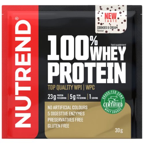 Z těch nejkvalitnějších surovin umíchal Nutrend koktejl různých jedinečných příchutí, které vás svou opravdovostí nepřestanou šokovat. V každém 100% Whey Protein je až 23 g bílkovin v jedné dávce, 5 g CAA v jedné dávce. Maximální efektivitu tréninku vám zajistí technologie CFM, díky které si bílkoviny zachovají všechny biologicky účinné složky. Základ produktu tvoří prémiový filtrovaný koncentrát mléčné syrovátky (WPC) spolu s nejčistší formou izolátu syrovátkové bílkoviny (WPI). Ideální pro ty, kdo rádi zkouší nové příchutě každý den a nepotřebují velké balení. Surovina INSTANT WHEY zajišťuje perfektní rozpustnost proteinu pro dokonalý komfort přípravy vašeho proteinového nápoje. Syrovátka použitá při výrobě je získána z mléka skotu, jehož strava se skládá minimálně 90 % z čerstvé trávy nebo pícnin, a jehož pobyt na volných pastvinách je samozřejmostí. Složení a nutriční hodnoty ke stažení v příloze. Doporučené dávkování: Dávku 30 g rozmíchejte ve 250 ml vody. V závislosti na denní potřebě bílkovin konzumujte 1–3 porce denně, mezi jídly. Maximálně 3 dávky denně. Nepřekračujte doporučené dávkování. Použití: 1 odměrka = cca 15 g. Dle doporučeného dávkování odměřte a rozmíchejte v šejkru. Po otevření skladujte při teplotě do 25 ºC a spotřebujte do 3 měsíců. Upozornění: Doplněk stravy, se sladidly. Nenahrazuje pestrou stravu. Není určeno pro děti do 12 let. Ukládejte mimo dosah dětí. Chraňte před teplem, mrazem a vlhkostí. Dodavatel: NUTREND D.S., a.s., Chválkovice 604, 779 00 Olomouc, Česká republika