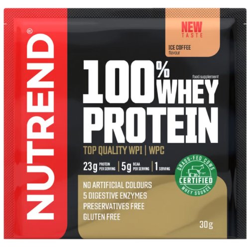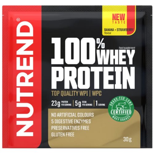 Z těch nejkvalitnějších surovin umíchal Nutrend koktejl různých jedinečných příchutí, které vás svou opravdovostí nepřestanou šokovat. V každém 100% Whey Protein je až 23 g bílkovin v jedné dávce, 5 g CAA v jedné dávce. Maximální efektivitu tréninku vám zajistí technologie CFM, díky které si bílkoviny zachovají všechny biologicky účinné složky. Základ produktu tvoří prémiový filtrovaný koncentrát mléčné syrovátky (WPC) spolu s nejčistší formou izolátu syrovátkové bílkoviny (WPI). Ideální pro ty, kdo rádi zkouší nové příchutě každý den a nepotřebují velké balení. Surovina INSTANT WHEY zajišťuje perfektní rozpustnost proteinu pro dokonalý komfort přípravy vašeho proteinového nápoje. Syrovátka použitá při výrobě je získána z mléka skotu, jehož strava se skládá minimálně 90 % z čerstvé trávy nebo pícnin, a jehož pobyt na volných pastvinách je samozřejmostí. Složení a nutriční hodnoty ke stažení v příloze. Doporučené dávkování: Dávku 30 g rozmíchejte ve 250 ml vody. V závislosti na denní potřebě bílkovin konzumujte 1–3 porce denně, mezi jídly. Maximálně 3 dávky denně. Nepřekračujte doporučené dávkování. Použití: 1 odměrka = cca 15 g. Dle doporučeného dávkování odměřte a rozmíchejte v šejkru. Po otevření skladujte při teplotě do 25 ºC a spotřebujte do 3 měsíců. Upozornění: Doplněk stravy, se sladidly. Nenahrazuje pestrou stravu. Není určeno pro děti do 12 let. Ukládejte mimo dosah dětí. Chraňte před teplem, mrazem a vlhkostí. Dodavatel: NUTREND D.S., a.s., Chválkovice 604, 779 00 Olomouc, Česká republika