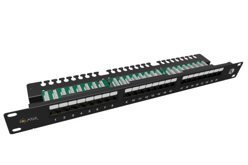 Patch panel Solarix s označením SX24L-5E-UTP-BK-N je panel osazený 24 porty RJ45, jehož součástí je vyvazovací lišta sloužící k přehlednému vyvázání a pevnému uchycení kabelů přímo k tělu panelu. Instalační kabel se zakončuje do duální IDC svorkovnice typu 110/Krone. Svorkovnice je z důvodu snadného zakončení kabelu označena podle standardu T568A i T568B. Stejně jako všechny ostatní komponenty strukturované kabeláže Solarix je tento panel vyroben tak, aby zaručoval maximální životnost, velmi dobrou funkčnost a především vysokou spolehlivost. Tento patch panel Solarix splňuje požadavky na komponenty kategorie 5E a třídy vedení Class D, které jsou definovány ve standardech ANSI/TIA 568, ISO/IEC 11801 a EN 50173, a to včetně všech nejnovějších dodatků. Barva patch panelu je černá; velikost v datovém rozvaděči je 1U. Součástí balení je 4x M6 montážní sada, a 24x vyvazovací pásek. Tento nový patch panel Solarix nahrazuje panel s označením SX24L-5E-UTP-BK.