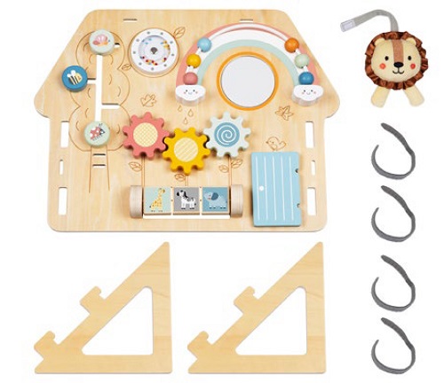 Tato hrací deska ve tvaru domečku s motivem lvíčka přináší spoustu zábavy, díky které bude moci Vaše dítě rozvíjet zručnost, zvídavost a jemnou motoriku. Různé aktivity jako je korálkový labyrint, ozubená kolečka, otáčecí a posuvné destičky s obrázky zvířátek a další dávají dítěti možnost procvičovat otáčení, otevírání či zavírání a připravit se tak na úkony každodenního života. Jemné barvy, roztomilé obrázky, zvuky, jako je chrastění perliček, a rozdílné textury povrchů stimulují smyslové vnímaní dětí. Deska je opatřena praktickými podpěrami ve tvaru trojúhelníku a je vyrobena ze dřeva s certifikací FSC®. Hlavní vlastnosti: podporuje jemnou motoriku a koordinaci ruka-okopodněcuje představivostsenzorická stimulacevyrobeno ze dřeva s certifikací FSC® vhodné od 1 roku věku Značka a certifikát FSC® (Forest Stewardship Council) zaručuje, že dřevo, ze kterého byl produkt vyroben, nebylo vytěženo nelegálně a pochází z lesů obhospodařovaných šetrným či přírodě blízkým způsobem, ve kterém jsou dodržovány přísné environmentální a sociální požadavky. Značka FSC® na výrobku znamená, že svým nákupem pomáháte chránit lesy a podporujete šetrné, odpovědné či přírodě blízké hospodaření, díky kterému jsou naše lesy stabilnější, zdravější, mají přirozenou druhovou skladbu a lépe odolávají negativním následkům klimatických změn.