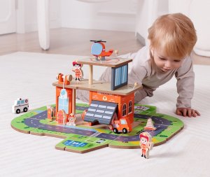 2Kids Toys Dřevěná stanice Hasiči 2 v 1. Hasičská stanice a Auto. Připrav se na akci! Tento unikátní výrobek spojuje dvě oblíbené dětské hračky do jednoho úžasného zážitku. Detailní hasičská stanice nabízí výjezdová vrata, cestu, řídící centrum, parkovací místa, záchranářské vybavení připravené na každou nouzovou situaci, figurky hasičů, vozů, psa a další. Potřebujete stanici přemístit jinam? Pak ji složte a proměňte ve stylové hasičské auto, které může okamžitě vyrazit na místo požáru! Ideální hračka pro malé hrdiny, kteří milují dobrodružství, stavění a záchranu! Hlavní vlastnosti: podněcuje fantaziirozvíjí jemnou motoriku učí děti týmové spolupráciauto i hasičská stanice v jednomobsahuje 13 dílů
