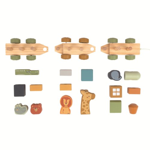 Nasazovací hra ve tvaru vláčku s lokomotivou a 2 vagónky, který veze roztomilá zvířátka, je skvělou pomůckou pro rozvoj jemné motoriky a logického myšlení dětí. Na dřevěných podvozcích jsou umístěny tyče, na které děti nasazují kostičky různých tvarů a stavějí tak barevný vláček. Součástí jsou také kostičky ve tvaru zvířátek – žirafa, slon, medvěd, lev, hroch a krokodýl. Díky připojené šňůrce mohou děti vláček převážet i se zvířátky a využít jako tahací hračku. Při hře si děti procvičují koordinaci ruka-oko, zlepšují úchop a přesnost pohybu, což přispívá k celkovému rozvoji motorických dovedností. Nasazování tvarů na správná místa podporuje koncentraci, trpělivost i schopnost řešit jednoduché úkoly. Děti se také učí rozpoznávat a pojmenovat barvy a zvířátka, což podporuje zrakové vnímání a jazykový rozvoj. Tato didaktická hračka je vhodná pro malé děti od 1,5 roku a nabízí zábavnou formu učení prostřednictvím hry. Hlavní vlastnosti: 19 dílůrozvíjí motorické dovednosti a koordinaci ruka-okopodporuje koncentraci a trpělivostučí rozpoznávání barev, tvarů a pojmenování zvířatvhodné od 1,5 roku