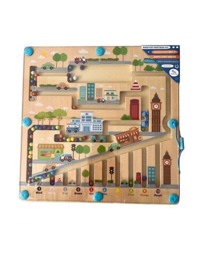 Vydejte se na cestu městem s barevnými kuličkami. Provedete úspěšně různobarevné kuličky všemi zákoutími? K převozu Vám pomohou barevné autobusy. K vedení kuliček se při hře využívá magnetické ukazovátko, které prověří dětskou trpělivost a koordinaci rukou a zraku. Dokážete pak navrátit kuličky zpět na své místo podle barvy? Zábavná dřevěná hra, která pomáhá dětem rozvíjet jemnou motoriku, orientovat se v prostoru a rozšiřovat slovní zásobu pojmenováváním barev a předmětů ve městě. Děti se také učí základy počtů formou hry. Dřevěná základna v designu města je kryta odolnou průhlednou plastovou deskou, hračka je díky tomu bezpečná. Hlavní vlastnosti:•úvod do světa počtů•rozvíjí motorické dovednosti dětí•zábavné i bezpečné díky magnetickému principu