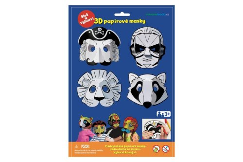 Papírové karnevalové masky - 4 ks - pirát, superhrdina, lev, mýval. Předvyražené masky slož podle obrázkového návodu a vymaluj si. Sada obsahuje 4 různé masky, gumičku, obrázkový návod. Barvy nejsou součástí balení. Masky jsou vyrobeny na kvalitním tvrdém papíru. Velikost masky 29 x 20 cm, velikost balení 33 x 23 cm. Vhodné pro děti od 3 let.