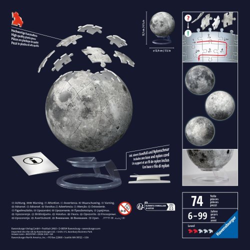 Postavte si svůj vlastní Měsíc svítící ve tmě z 3D plastových dílků. Dílky perfektně drží pohromadě bez nutnosti lepení díky patentované technologii EasyClick. Jedinečný model dekorativní za denního světla a atmosférický v noci. Měsíc lze umístit na jakýkoli povrch pomocí přiloženého podstavce nebo zavěsit ke stropu pomocí přiložené šňůry.