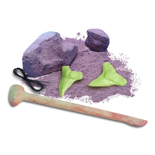 Obsahuje 2 žraločí zuby svítící ve tmě zalité do sádrového bloku, speciální nástroj, provázek a instrukce.