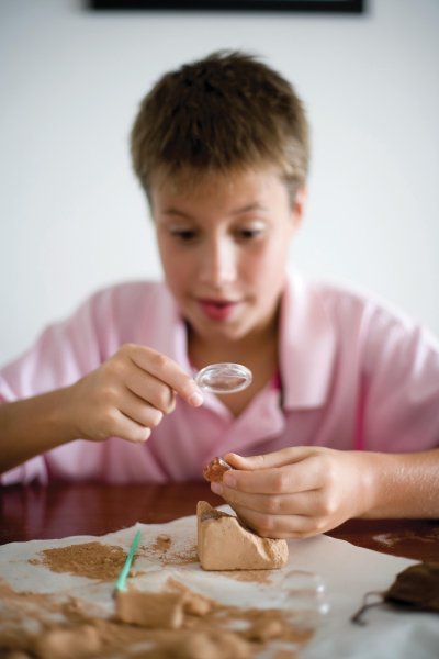 Dolování minerálů: Souprava obsahuje blok měkké hlíny, ve kterém jsou ukryté minerální krystaly. Pomocí přiloženého nářadí, jako je kladívko a dlátko, mohou děti opatrně vykopat a odkrýt skryté krystaly. Tím se učí trpělivosti a základním technikám archeologie a geologie.