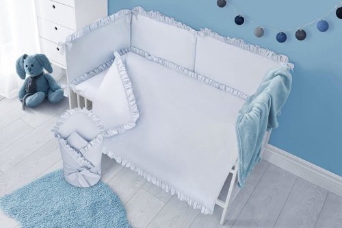 Krásná dětská bavlněná 5-dílná souprava do postýlky Belisima PURE pro miminka. Je vyrobena z měkkého, příjemného materiálu. Souprava obsahuje povlečení na polštářek cca 40x60 cm, povlečení na peřinku cca 90x120 cm, mantinel cca 180 cm, výplň polštářek a peřinka. Materiál 100% bavlna.<BR>Tyto výrobky jsou bezpečné, protože:<BR>- přírodní bavlna nezpůsobuje odřeniny a podráždění, jelikož neobsahuje formaldehydy a další prvky, které kojencům škodí<BR>- neztrácí barvu a nezabarvuje oblečení<BR>- nabízené vzory jsou příjemné na pohled a mají uklidňující barvy<BR>- zipy používané u povlečení jsou tzv. "bezpečné zipy" bez volně visící koncovky, kterou by mohlo dítě utrhnout a spolknout<BR>- nejsou použity žádné knoflíky ani žádné další plastové nebo ocelové části, které mohou být pro Vaše dítě nebezpečné<BR>- materiál, který je používán pro výplně polštářů a přikrývek, je 100% protialergický, což znamená, že se v jeho vláknech nešíří žádné mikroorganismy ani plíseň.