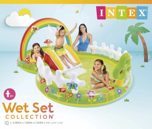 rozměry: 2,9 x 1,8 x 1,04 m, duhový rozstřikovač vody, součástí 2 nafukovací houby, 4 motýlci, 3 míčky, skluzavka, kapacita 450l, max. nosnost 54 kg, opravná sada