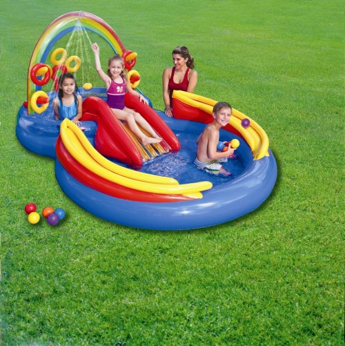 Dětské hřiště - skluzavka obsahuje 2 hlavní části, spojené skluzavkou. V obou částech se lze koupat, herní doplňky zpestří mrňousům zábavu. Nad skluzavkou je připevněna mini sprcha pro snadné klo
