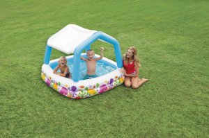 Dětský bazén se střechou, velikost: 157 x 157 x 122 cm, objem: 295 l, výška hladiny: 22 cm, odnímatelná nafukovací stříška, vinyl 0,25 mm, vypouštěcí ventil, opravná sada