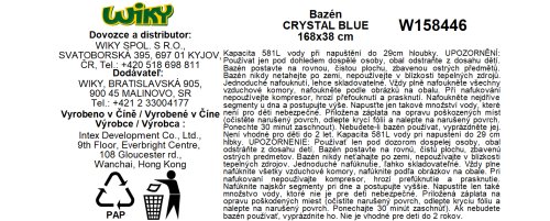 Dětský nafukovací bazén. Je vyroben z pevného materiálu, který je odolný vůči poškození. Má měkké příjemné dno a je složen ze tří komor. Objem vody při výšce hladiny 29 cm činí 581 litrů. Bazén má rozměry 168 x 38 cm a je vhodný pro děti od 2 let. Součástí balení je sada na opravu drobných poškození. Rozměry balení 31 x 27 x 8 cm. Vhodné pro děti od 2 let.