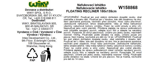 Tvar je uzpůsoben pro maximální pohodlí ve vodě. Součástí jsou dva držáky na pití a také dvě držadla. V balení je opravná záplata. Rozměry: délka 180 cm, šířka 135 cm. Materiál: kvalitní 0,45 mm vinyl.