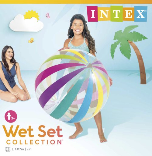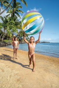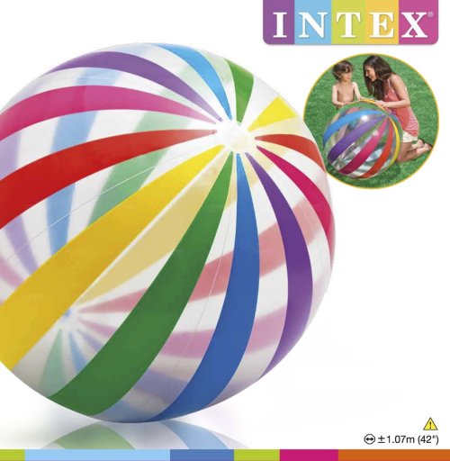 Nafukovací velký míč s barevnými puntíky. Vhodný do vody a nebo na plážový volejbal. Průměr 107 cm. Věk: 3+