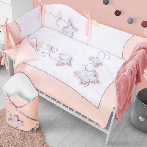 Krásná dětská bavlněná 6-dílná souprava do postýlky Belisima Butterfly pro miminka. Je vyrobena z měkkého, příjemného materiálu. Souprava obsahuje povlečení na polštářek cca 40x60 cm, povlečení na peřinku cca 100x135 cm, mantinel cca 180 cm, výplň polštářek a peřinka, nebesa. Materiál 100% bavlna.<BR>Tyto výrobky jsou bezpečné, protože:<BR>- přírodní bavlna nezpůsobuje odřeniny a podráždění, jelikož neobsahuje formaldehydy a další prvky, které kojencům škodí<BR>- neztrácí barvu a nezabarvuje oblečení<BR>- nabízené vzory jsou příjemné na pohled a mají uklidňující barvy<BR>- zipy používané u povlečení jsou tzv. "bezpečné zipy" bez volně visící koncovky, kterou by mohlo dítě utrhnout a spolknout<BR>- nejsou použity žádné knoflíky ani žádné další plastové nebo ocelové části, které mohou být pro Vaše dítě nebezpečné<BR>- materiál, který je používán pro výplně polštářů a přikrývek, je 100% protialergický, což znamená, že se v jeho vláknech nešíří žádné mikroorganismy ani plíseň.
