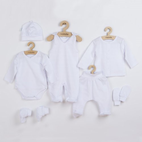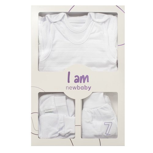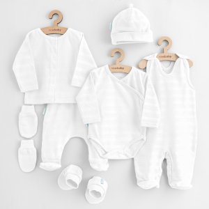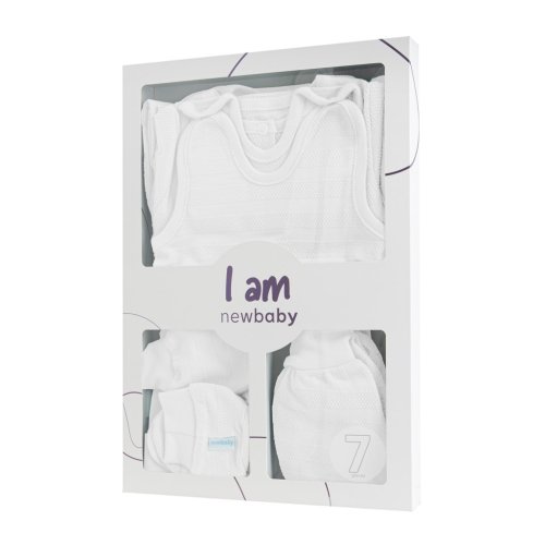 Roztomilá kojenecká 7-dílná soupravička české značky New Baby I AM pro miminka. Soupravička je vyrobena z velmi příjemného, měkkého a kvalitního materiálu, který je vhodný pro miminka a je vhodná nejen do porodnice. Obsahuje celorozepínací body s dlouhým rukávkem, dupačky, polodupačky, kabátek, čepičku, rukavičky a capáčky. Body má boční zapínání po celé délce a mezi nožičkama na cvočky. Dupačky mají zapínání na cvočky na ramínkách a mezi nožičkama, coš usnadní oblékání a přebalování. Kabátek má zapínání na cvočky po celé délce. Čepička s širším lemem dobře drží na hlavičce miminka a nepadá. Je velmi praktická a netlačí na hlavičku miminka. Rukavičky a capáčky mají širší stahovací manžetku. Celá soupravička má nový neobyčejný design s atraktivním vzorem látky. Je navržena s ohledem na potřeby miminka a je vhodná i jako milý dáreček. Soupravička je v praktické Eko krabičce. Složení: 100% bavlna.