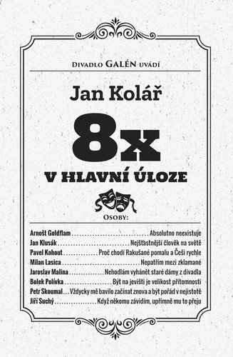 Osm rozhovorů emeritního šéfredaktora Divadelních novin Jana Koláře s nepřehlédnutelnými osobnostmi našeho divadelnictví vznikalo v průběhu let 2010 až 2021. Co jméno, to pojem. Arnošt Goldflam, Jan Klusák, Pavel Kohout, Milan Lasica, Jaroslav Malina, Bolek Polívka, Petr Skoumal a Jiří Suchý – jejich cesty životem a uměním jsou zároveň výpovědí o cestách české a slovenské kultury i společnosti posledních let. Tři zpovídaní již bohužel nejsou mezi námi, ale všechny rozhovory jsou stále aktuální, některé dokonce možná nadčasové.OBSAH:Úvod * Arnošt Goldflam: Absolutno neexistuje * Jan Klusák: Nejšťastnější člověk na světě * Pavel Kohout: Proč chodí Rakušané pomalu a Češi rychle * Milan Lasica: Nepatřím mezi zklamané * Jaroslav Malina: Nehodlám vyhánět staré dámy z divadla * Bolek Polívka: Být na jevišti je velikost přítomnosti * Petr Skoumal: Vždycky mě bavilo začínat znova a být pořád v nejistotě * Jiří Suchý: Když někomu závidím, upřímně mu to přeju * Jmenný rejstřík