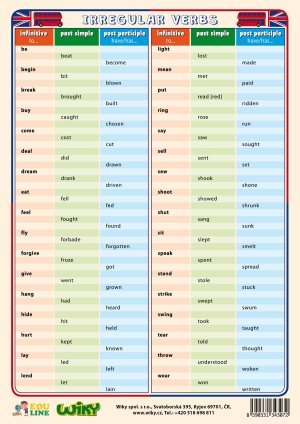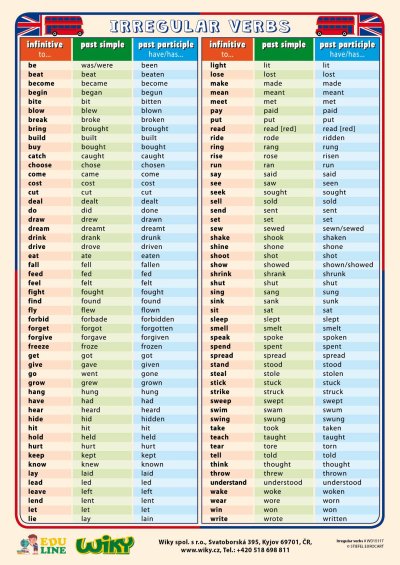 Obsah naučné tabule tvoří nepravidelné tvary 100 frekventovaných významových sloves v tvarech infinitiv, minulý čas, minulé příčestí.