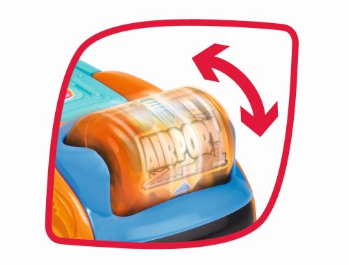 Autobus na volnoběh, s otočným chrastítkem s cílovou stanicí, s otevíracími dveřmi a bočním pohyblivým prvkem. Délka 22 cm.