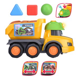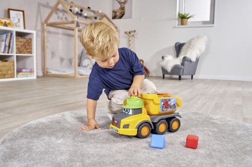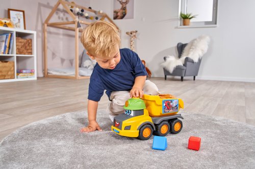 Nákladní auto Harry Hauler s očíčky pro nejmenší. Na volnoběh, třídění tvarů - 3 tvary chrastítek k vložení, zvukový a světelný efekt, posuvné prvky, různá čela, sklápeč dolů a nahoru. Délka 30 cm.