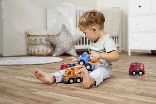 Veselé pracovní autíčko pro nejmenší, na volnoběh. Namalovaná očíčka, zvukový a světelný efekt. 3 druhy - sklápěčka, míchačka, nákladní auto. Délka 13 cm.