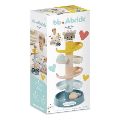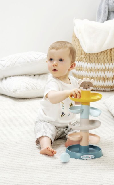 Věž k sestavení pro nejmenší v jemných barvách s míčky a hlavou medvídka na vrcholu. Trénuje motoriku a koordinaci dítěte. Rozměry věže (DxŠxV): 16,5 x 16,5 x 34 cm.