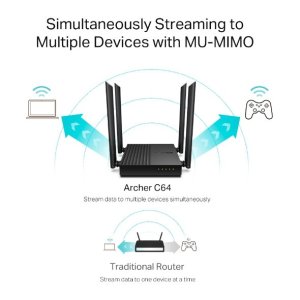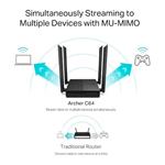 Zařízení značky TP-Link Archer C64 umožňuje připojit více zařízení a streamovat současně díky dvěma bezdrátovým pásmům 2,4 GHz a 5 GHz. Pásmo 2,4 GHz poskytuje spolehlivé připojení pro odesílání e-mailů, prohlížení webu a další jednoduché úkoly. Pásmo 5 GHz poskytuje rychlost až 867 Mb/s, což je skvělé pro multimediální náročné aplikace, jako je streamování videa a hraní online her. Díky připojení bez zpoždění už nikdy nic nezmeškáte.