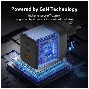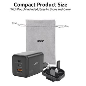 Acer 100W GaN charger - Black; 3 nabíjecí porty: 2x USB-C + 1x USB-A; podpora rychlého nabíjení (protokoly PD3.0, PPS, Quick Charge, FCP, SCP); celkový výkon max. 100W; 1,5 m USB-C kabel; 41 x 45 x 66mm bez zástrčky; hmotnost 228 g; EU a UK zástrčka; textilní obal; černý; pro telefony, tablety, notebooky