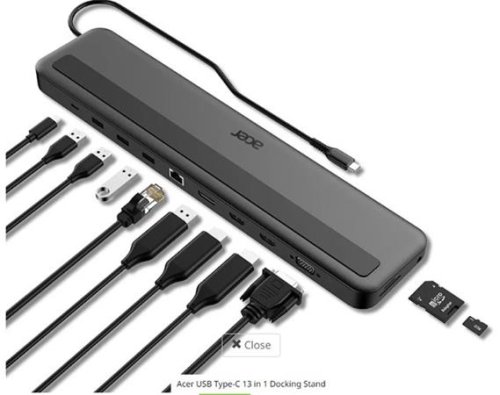 Acer 13in1 Type C Minidock: 3x USB3.0 (5Gbps Data Transfer), 1x USB-C (5Gbps Data transfer), 1x USB-C Power Delivery (up to 100W), 1x SD/TF card slot, 2x HDMI (až 3840x2160P@60Hz), 1x Display Port (až 3840x2160P@60Hz), 1x VGA port (až FHD@60Hz), 1x RJ-45 (Gigabit Ethernet); 3.5mm Audio (up to 96kHz audio output)