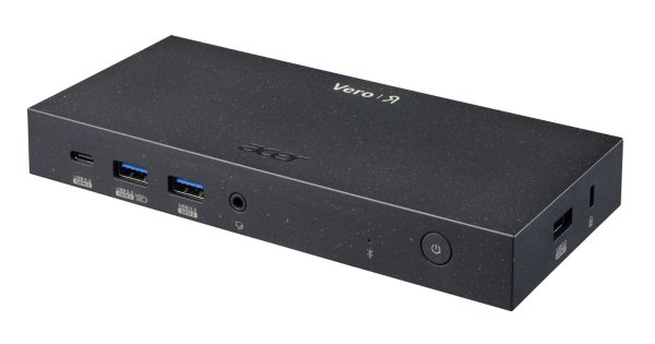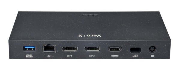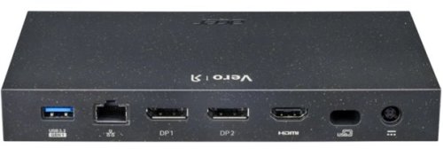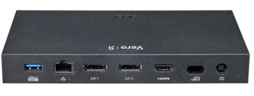 Acer Vero MST Dock M33 100W PD - 1x USB-C Host (100W Power Delivery); 1x USB-C 3.2 Gen2 10 Gb/s; 1x USB-A 3.2 Gen2 10Gb/s; 1x USB-A 3.2 Gen2 10Gb/s (BC 1.2); 2x USB-A USB 3.2 Gen1 5 Gb/s; 1x HDMI 2.0b; 2x Display port 1.4; 1x RJ45 1 GB/s; 1x 3.5 mm Combo Audio jack; Kensington lock; MAPT, PXE, WOL (MS, S3, S4, S5), Power button and LED Mirror (require NB BIOS/SW support); 135W AC Adapter EU plug; 180 x 82 x 25 mm; 232 g; Black (PCR); (Retail pack)