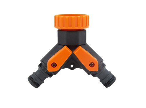 rozdělovač umožňuje současné připojení dvou zahradních hadic k jednomu kohoutku