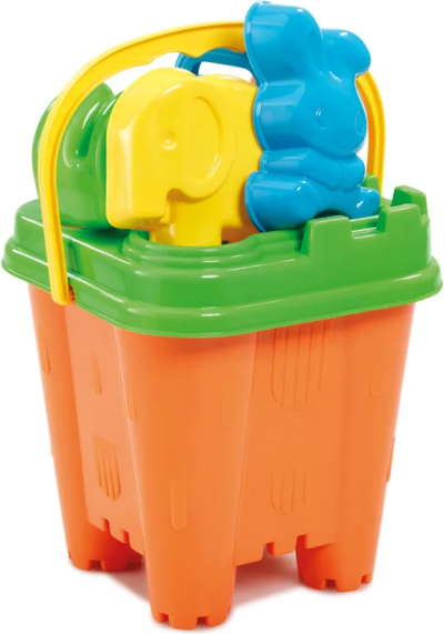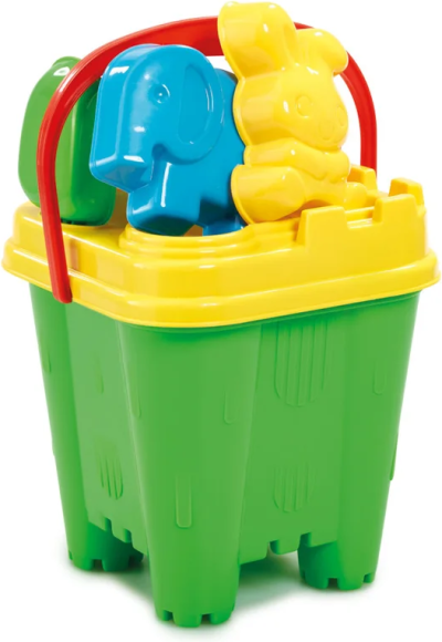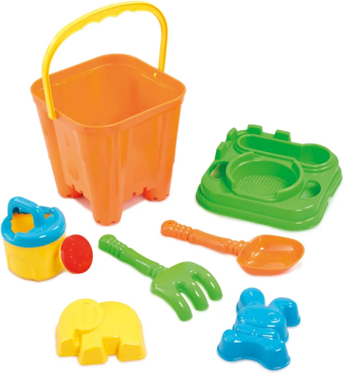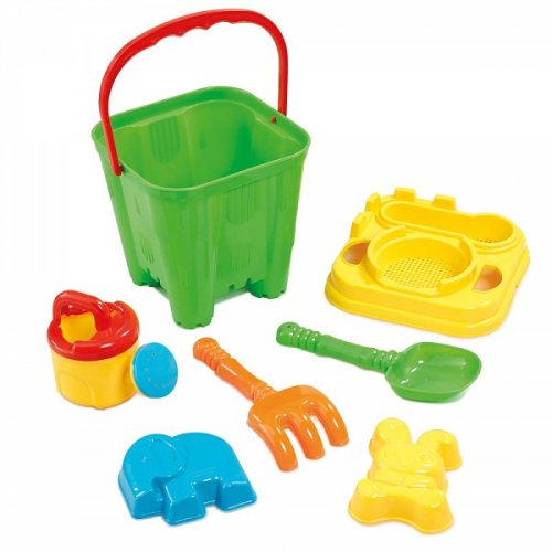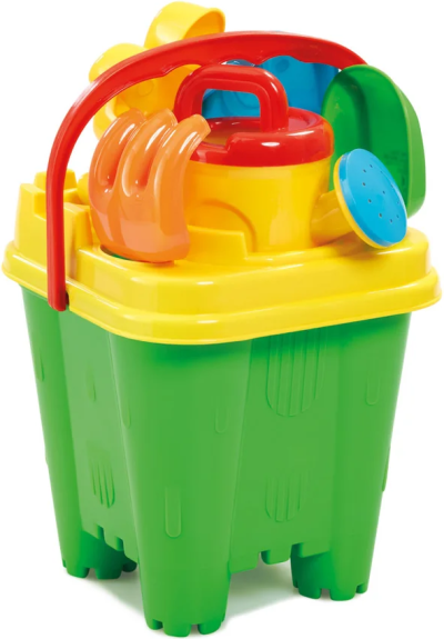 1 kbelík s odnímatelným víkem, které slouží jako sítko, 1 konev, 1 hrábě, 1 rýč, 2 formičky.