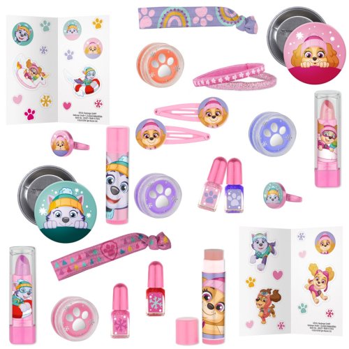 Adventní kalednář Tlapková patrola Winter Wonderland – kosmetický pro děvčata. Obsahuje – 2× sponka do vlasů, 2× prstýnek, 2× gumičku na ruku nebo do vlasů, 2× aršík se samolepkami, 2× mašli do vlasů, 2× rtěnku, 2× balzám na rty, 4× lak na nehty, 4× stíny se třpytkami, 2× placku se špendlíkem.