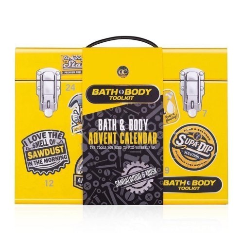 Adventní kalendář BATH BODY TOOLKIT v dárkové krabici na nářadí.Obsah: 1. gel sprchový/šampon, 2. mýdlo, 3. vodováha, 4. mléko tělové, 5. kartáček na nehty, 6. nůžky na nehty, 7. peeling, 8. šestihranný klíč, 9. sůl do koupele, 10. multifunkční nástroj, 11. voda po holení, 12. holící strojek, 13. otvírák na lahve, 14. mýdlo, 15. svinovací metr, 16. gel sprchový, 17. karabina, 18. mléko tělové, 19. čistící hadřík, 20. peeling na ruce, 21. fizzer, 22. klíčenka, 23. gel sprchový/šampon, 24. placatkaRozměry: 23 x 31 x 14 cm