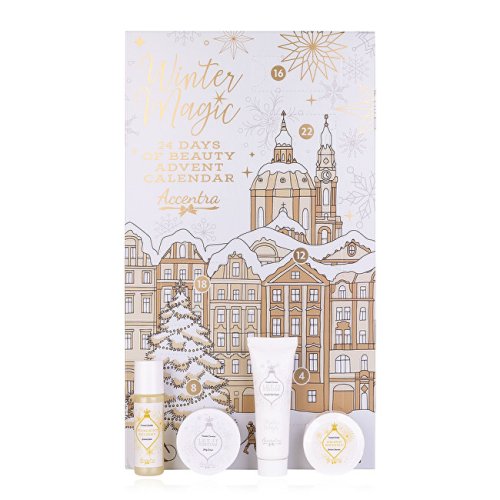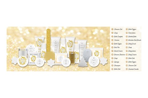 Adventní kalendář obsahuje: 1. Sprchový gel 2. Mýdlo 3. Konfety do koupele 4. Pemza 5. Šumivá bomba do koupele 6. Pilník na nehty 7. Krém na ruce 8. Tableta do sprchy 9. Mýdlo10. Mycí houba11. Šampon12. Sůl do koupele13. Šumivá bomba do koupele14. Mléko na nohy15. Pěna do koupele16. Dřevěný kartáček na nehty17. Tělový peeling18. Mýdlo19. Tělové mléko20. Tělový krém21. Sůl do koupele22. Šumivá bomba do koupele23. Sprchový gel24. Vonná svíčka