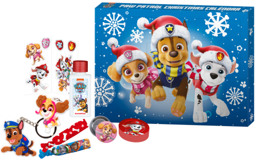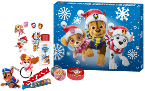 Adventní kosmetický kalendář dětský Tlapková patrola. Kalendář obsahuje 3 čelenky do vlasů, 1 klíčenku, 4 přívěsky na klíče, 4 odznaky, 4 psí známky s řetízkem, 1 tělové mléko, 1 sprchový gel, 2 sady nálepek, 3 balíčky konfet do vany, 3 šumáky do vany. Vše dermatologicky testováno, odpovídám normám EU.