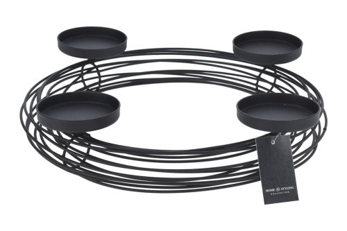 Kulatý kovový svícen o rozměru 355 × 320 × 70 mm pojme 4 čajové svíčky. Černé provedení dodává interiéru moderní a elegantní vzhled. Stabilní konstrukce zajišťuje bezpečné používání a možnost variabilního aranžmá na stůl, parapet nebo poličku. Ideální pro adventní a vánoční dekorace.