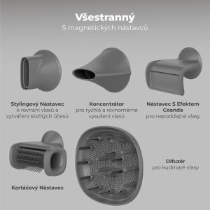 Fén AENO HD5 nabízí všestranné možnosti úpravy vlasů díky pěti snadno vyměnitelným magnetickým nástavcům: