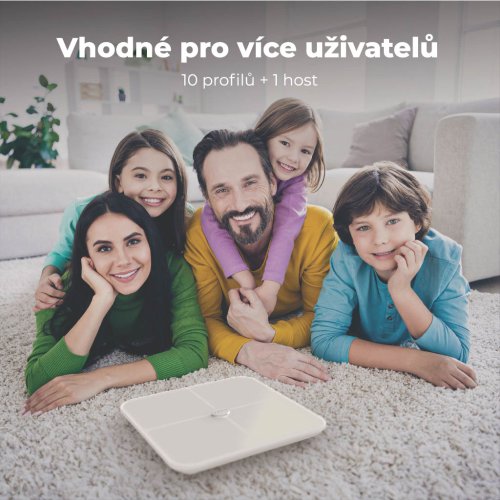Naše váhy jsou ideální pro rodiny nebo sdílenou domácnost a podporují až 10 různých uživatelských profilů a jeden profil hosta. Každý uživatel může využívat personalizované sledování a na míru šité zdravotní poznatky. Tato funkce zajišťuje, že každý člen vaší domácnosti může spravovat své zdraví nezávisle, což usnadňuje dosažení individuálních cílů v oblasti fitness.