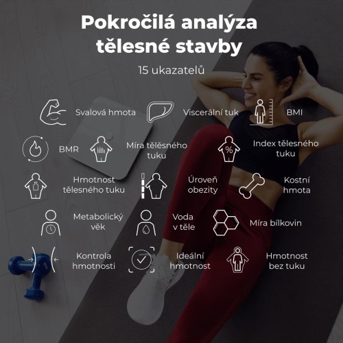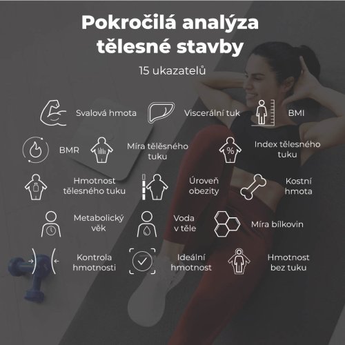 Svalová hmota, index viscerálního tuku, BMI (index tělesné hmotnosti), BMR (bazální metabolická rychlost), míra tělesného tuku, index tělesného tuku, hmotnost tělesného tuku, úroveň obezity, kostní hmota, metabolický věk, voda v těle, míra bílkovin, kontrola hmotnosti, ideální hmotnost, hmotnost bez tuku.