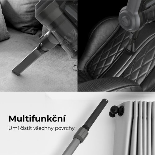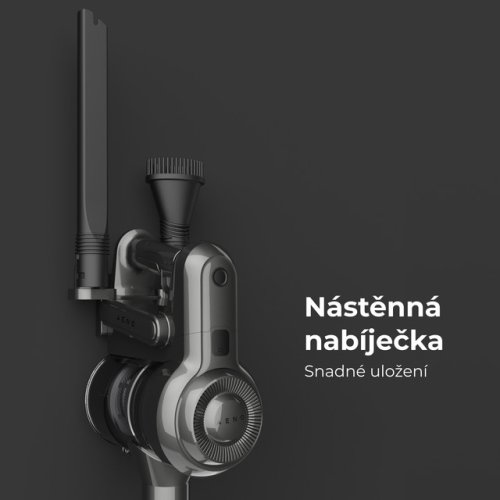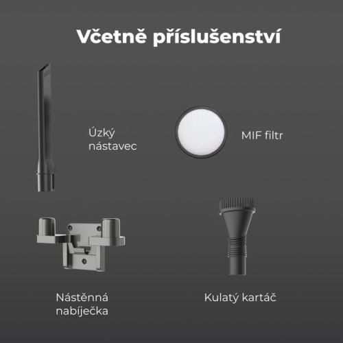Příslušenství: Hliníková trubka, elektrický podlahový kartáč, nabíječka, tyčové sání, kulatý sací kartáč, šrouby pro montáž na stěnu, 4 samolepící nálepky na zeď