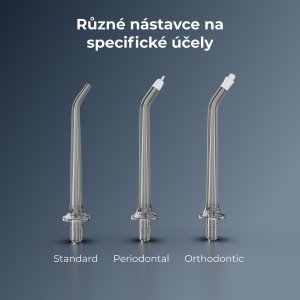 AENO DI3 se dodává s komplexní sadou trysek, z nichž každá je určena pro konkrétní účel : standardní pro běžné použití, parodontální pro hloubkové čištění a ortodontická tryska pro osoby s rovnátky.