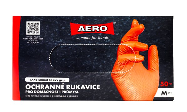 AERO Exanit® je skupinou rukavic z nitril-kaučuku. Silnější materiál zajišťuje odolnost a speciální protiskluzová úprava povrchu nabízí vynikající úchop za mokra i za sucha při zachování vysoké zručnosti a flexibility.