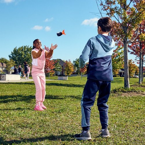 Házejte a chytejte jako profesionál s aerodynamickým americkým fotbalovým míčem Aerobie Super Sonic Fin Catch, který má malé rozměry a měkký pěnový materiál pro snadné chytání. Tento aerodynamický americký fotbalový míč/raketa, oficiálně schválený Russellem Wilsonem, quarterbackem týmu Denver Broncos, vám do rukou vloží sílu profesionála. Inovativní dutá gyroskopická konstrukce umožňuje aerodynamický let. Díky zábavnému tvaru amerického míče a přesnému vyvážení je s míčem Super Sonic Fin Catch snadné házet a chytat jako váš oblíbený quarterback NFL. Natočte míč, zamiřte a pošlete ho směrem ke svým spoluhráčům a sledujte, jak chytají. Super Sonic Fin Catch poskytuje nádherný spirálový hod a je ideální pro děti i dospělé. Skvěle se hodí pro zahradní hry, venkovní dětské a rodinné hry. Parádní modrý a oranžový design vynikne na zahradě, u bazénu nebo na pláži při vzrušujících hrách amerického fotbalu. Super Sonic Fin Catch je doporučen pro děti ve věku 8-14 let. Jazykové mutace: CZ, SK, EN, ESP, DE, PL, IT. Rozměry míče: 13,3 x 8,3 x 8,3 cm. Rozměry balení: 18,42 x 9,53 x 8,89