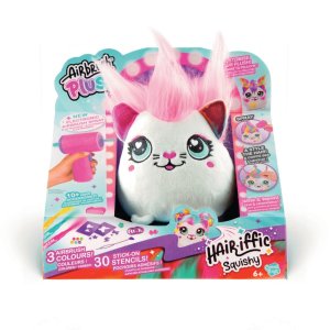 Airbrush kreativní sada Hair´iffic s vlasatým plyšákem skvěle zabaví každého. Uvnitř balení najdete jednoho plyšáka s vlásky, airbush nástroj na baterie (2 ks AA/LR6 – nejsou součástí balení), 3 fixy a 30 šablon, se kterými můžete plyšáka vyzdobit podle své fantazie. Když vás design omrzí, stačí plyšáka vyprat dle návodu a po uschnutí můžete znovu tvořit. Série obsahuje 2 druhy plyšáků – Princess a Precious.<br> Vhodné pro děti od 6ti let.