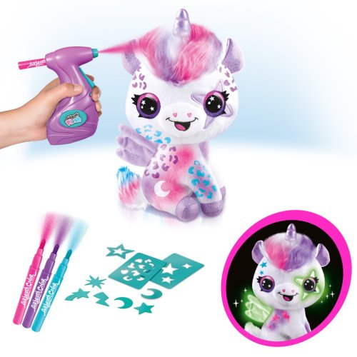 Navrhni a vybarvi si svého kouzelného jednorožce, který dokonce svítí ve tmě Plyšové zvířátko si můžeš pomocí airbrush libovolně posprejovat, můžeš využít různé barvy a šablony Fantazii se meze nekladou Pokud se ti vytvořený design přestane líbit, stačí plyšáka omýt vodou a můžeš začít znovu