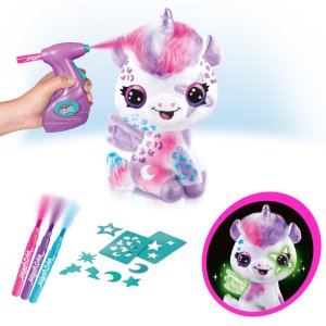 Navrhni a vybarvi si svého kouzelného jednorožce, který dokonce svítí ve tmě. Součástí tohoto balení je plyšové zvířátko, airbrush nástroj, 3 různé barevné náplně, 60 různých šablon a návod. Plyšové zvířátko si můžeš pomocí airbrushe libovolně posprejovat, můžeš využít různé barvy a šablony. Fantazii se meze nekladou. Pokud se ti vytvořený design přestane líbit, stačí plyšáka omýt vodou a můžeš začít znovu. Výrobek je vhodný pro děti od 6 let a vyžaduje 2× AA baterie, které nejsou součástí balení.